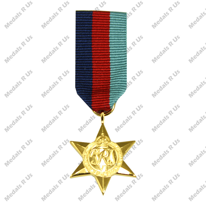 This six-pointed star has a circular centre with the GRI/VI monogram, surmounted by the Royal crown, and inscribed ‘The 1939-1945 Star’.