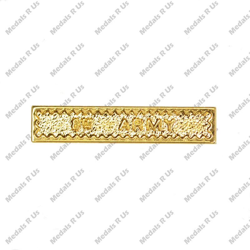 This has a frame with an inside edge which resembles the perforated edge of a postage stamp, and is inscribed “8TH ARMY”. This clasp is worn on the Africa Star.