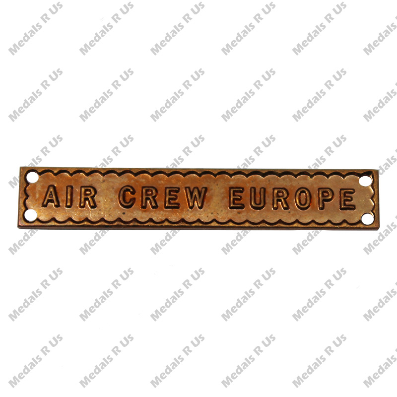 This clasp has a frame with an inside edge which resembles the perforated edge of a postage stamp, and is inscribed “AIR CREW EUROPE”. This clasp is worn on the Atlantic Star.