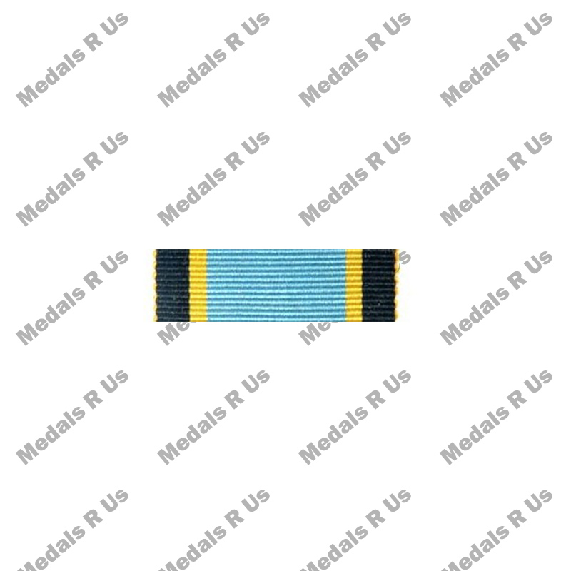 The ribbon is 32mm wide and has light blue centre (18mm), with thin stripes of yellow (2mm) on either side with borders of black (5mm). These colours and the layout represents the continuous service of the Air Force during both night and day.
