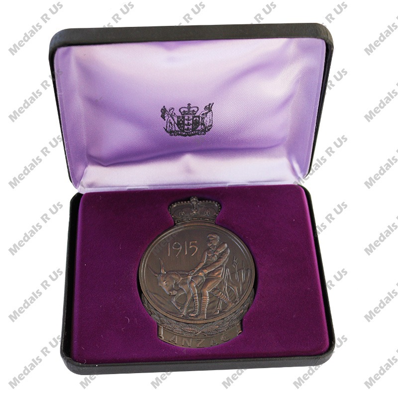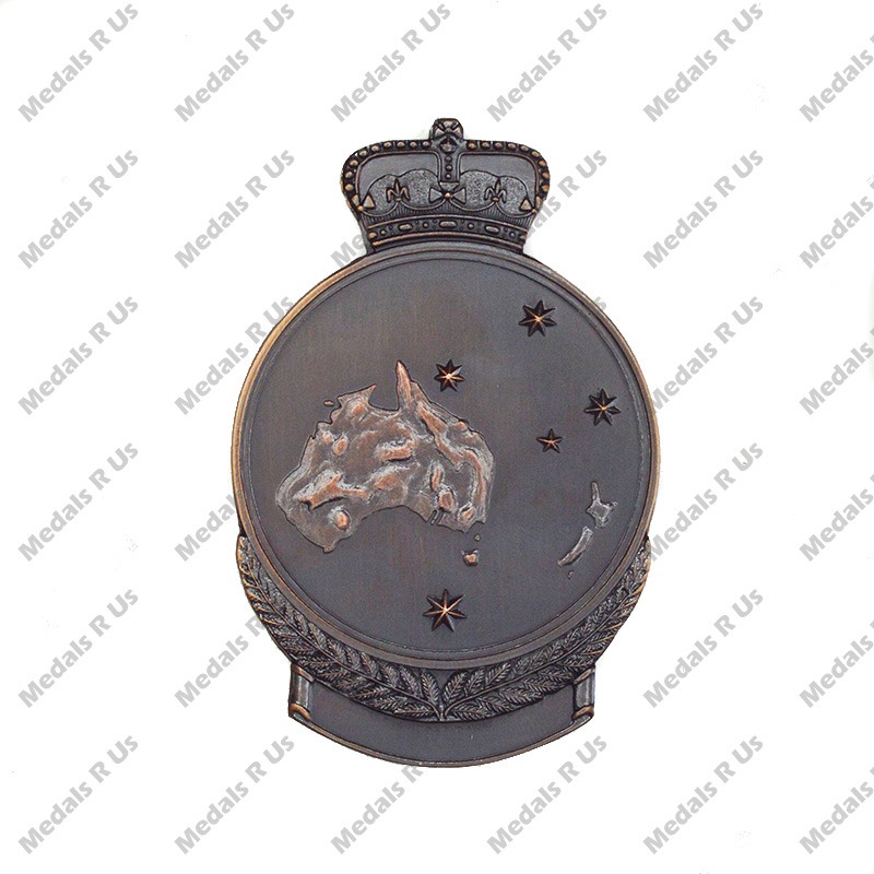 The circular portion of the reverse has a map of Australia and New Zealand with the Southern Cross. Beneath which is a wreath of fern leaves (representing New Zealand) and a blank scroll allowing for the inclusion of the recipient’s name.