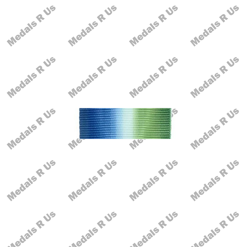 The ribbon is 32mm wide, and is watered silk coloured blue, white and green. These colours symbolise service in the Atlantic Ocean, and in UK and North Russian waters.