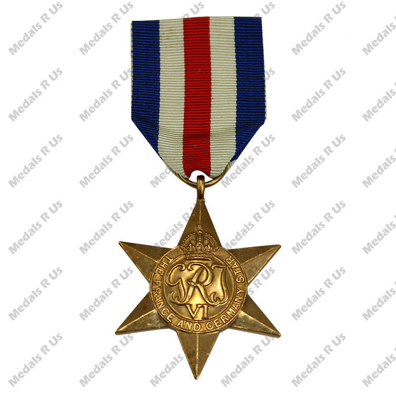 This six-pointed star has a circular centre with the GRI/VI monogram, surmounted by the Royal crown, and inscribed ‘The France and Germany Star’.