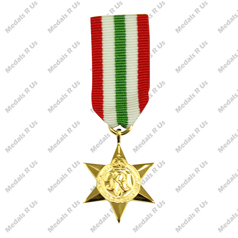 This six-pointed star has a circular centre with the GRI/VI monogram, surmounted by the Royal crown, and inscribed ‘The Italy Star’.