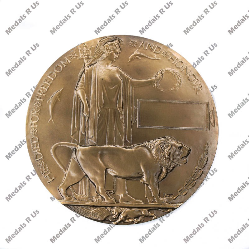 This Plaque is 120mm in diameter and shows Britannia bestowing a laurel crown on a rectangular blank tablet allowing for the inclusion of the full name of the dead service person. In front of Britannia stands the British lion, with dolphins in the upper field, an oak branch in the lower right, and a lion cub clutching a fallen eagle at the very bottom of the plaque.