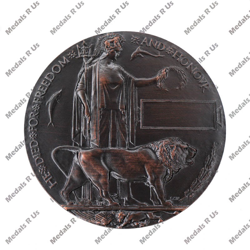 This Plaque is 80mm in diameter and show Britannia bestowing a laurel crown on a rectangular blank tablet allowing for the inclusion of the full name of the dead service person. In front of Britannia stands the British lion, with dolphins in the upper field, an oak branch in the lower right, and a lion cub clutching a fallen eagle at the very bottom of the plaque.