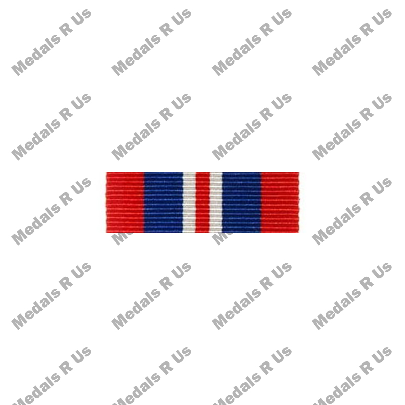 The ribbon is 32mm wide. The ribbon is the red, white, and blue of the (British) Union Flag. There is a narrow central red stripe (2mm) with a narrow white stripe (2mm) on either side. There are broad red stripes (6.5mm) at either edge, the two intervening stripes (6.5mm) being blue.